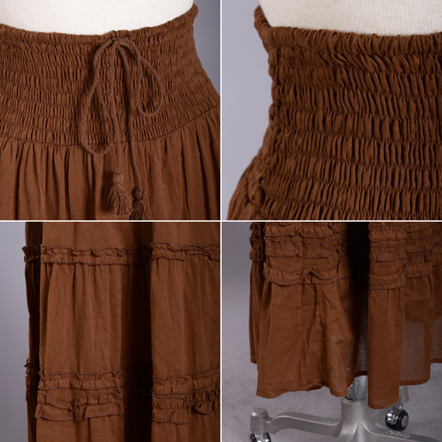 ■商品アピール ベアワンピースとてし着れて、その日の気分で楽しめる2wayのマキシ丈スカート。裏地付きでウエストゴムなので締 め付け感もありません。落ち着いたブラウンなので秋まで使えるアイテムです。タッセルの紐がかわいいです。